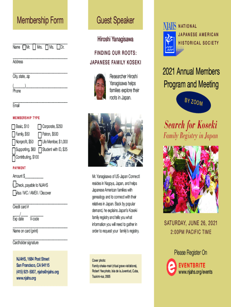 Membership Form ___ Name q Mr. q Mrs. q Ms. q Dr. ___ Address___ City, state, zip (___)___ Phone ___ EmailGuest Speaker Hiroshi Yanagisawaq Corporate, $250q Family, $50q Patron, $500q Nonprofit, $50q