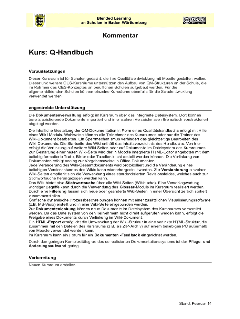Blended Learning an Schulen in BadenWrttembergKommentarKurs: QHandbuch Voraussetzungen Dieser Kursraum ist fr Schulen gedacht, die ihre Qualittsentwicklung mit Moodle gestalten wollen. Dieser und