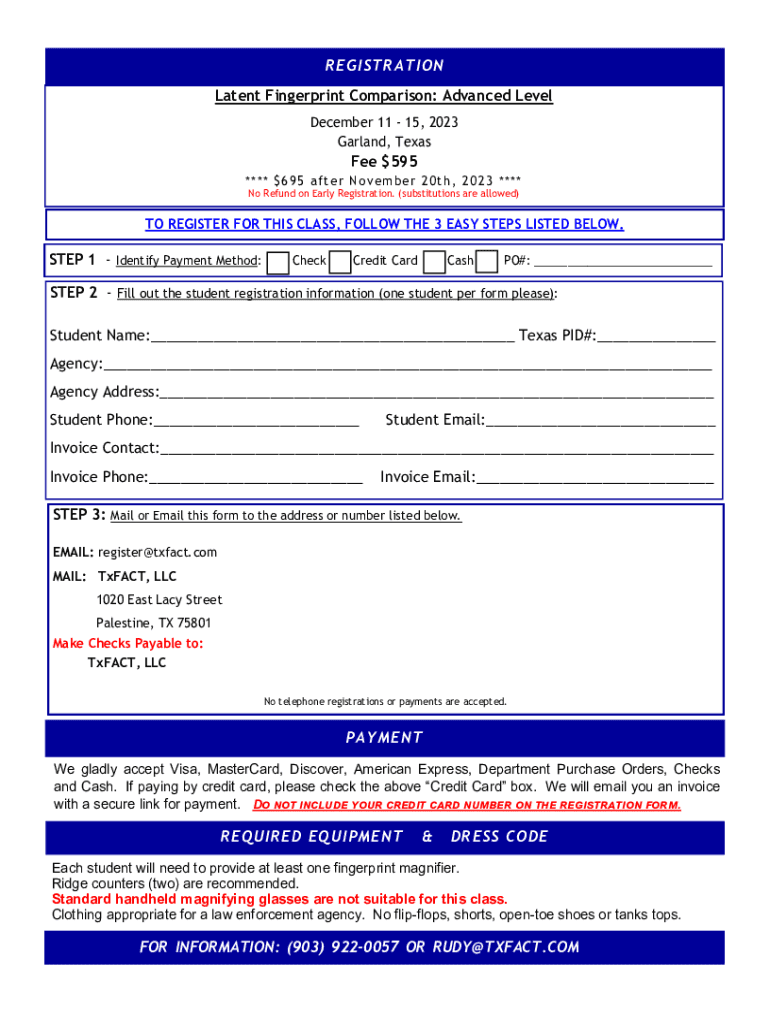 Latent Fingerprint Comparison: Advanced Level Part of our Friction Ridge Evidence Series presented byTxFACT Hosted by: Garland Police DepartmentDecember 11 15, 2023 Location: 1891 Forest Lane Garland,