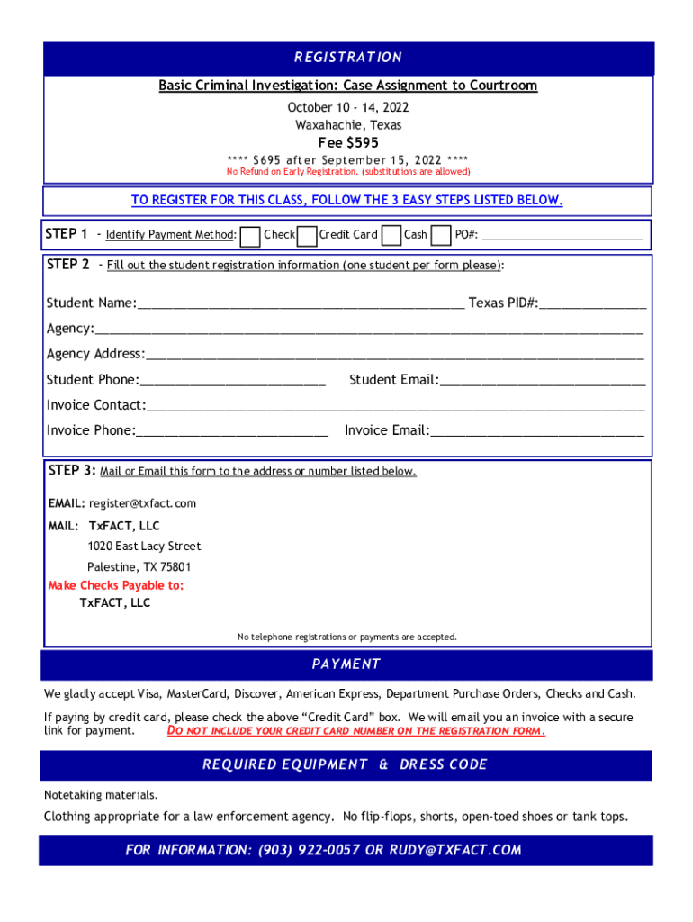 Basic Criminal Investigation: Case Assignment to Courtroom presented byTxFACT Hosted by Waxahachie Police DepartmentOctober 10 14, 2022 LOCATION: 630 N. Farley Street, Waxahachie, TXTIME: 8AM to 5PMABOUT