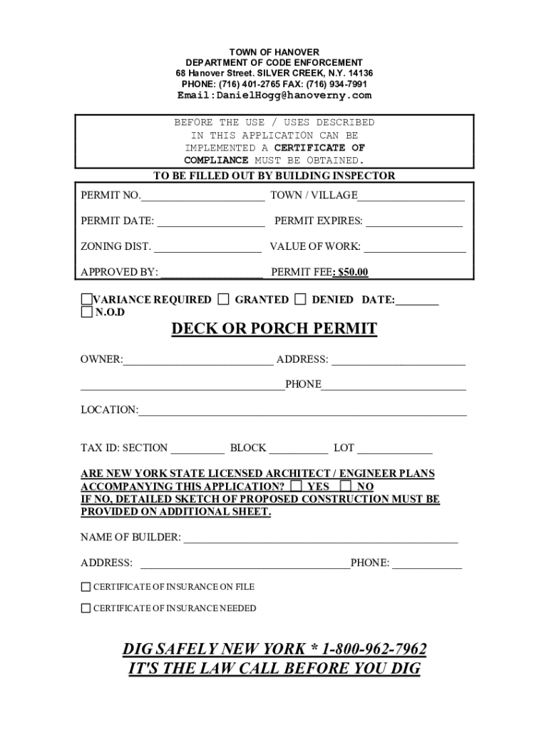 TOWN OF HANOVER DEPARTMENT OF CODE ENFORCEMENT 68 Hanover Street. SILVER CREEK, N.Y. 14136 PHONE: (716) 4012765 FAX: (716) 9347991Email:DanielHogg@hanoverny.comBEFORE THE USE / USES DESCRIBED IN THIS
