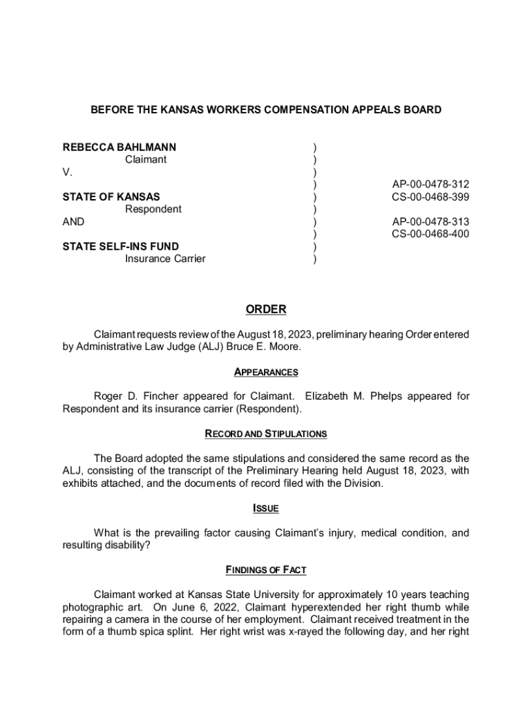 BEFORE THE KANSAS WORKERS COMPENSATION APPEALS BOARDREBECCA BAHLMANN Claimant V.) ) ) ) ) ) ) ) ) )STATE OF KANSAS Respondent AND STATE SELFINS FUND Insurance CarrierAP000478312 CS000468399 AP000478313