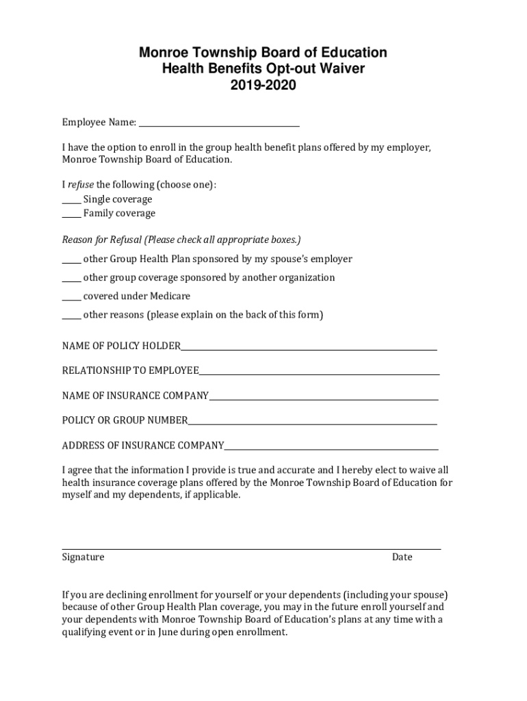 Monroe Township Board of Education Health Benefits Optout Waiver 20192020 Employee Name: ___ I have the option to enroll in the group health benefit plans offered by my employer, Monroe Township Board