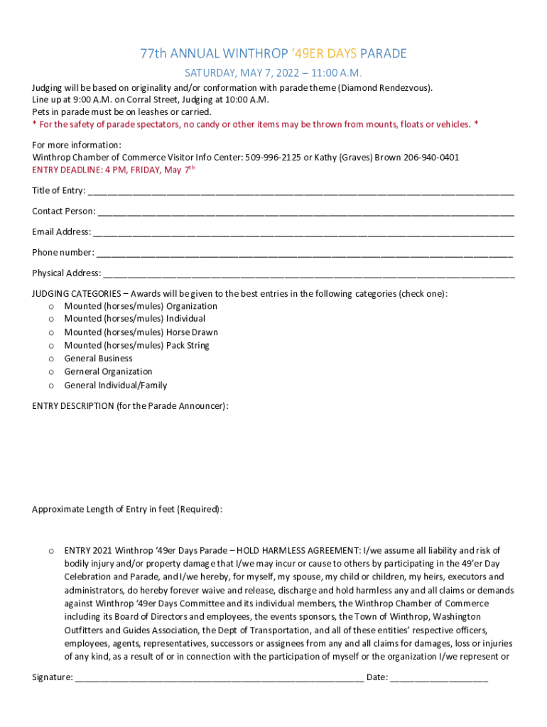 77th ANNUAL WINTHROP 49ER DAYS PARADE SATURDAY, MAY 7, 2022 11:00 A.M. Judging will be based on originality and/or conformation with parade theme (Diamond Rendezvous). Line up at 9:00 A.M. on Corral