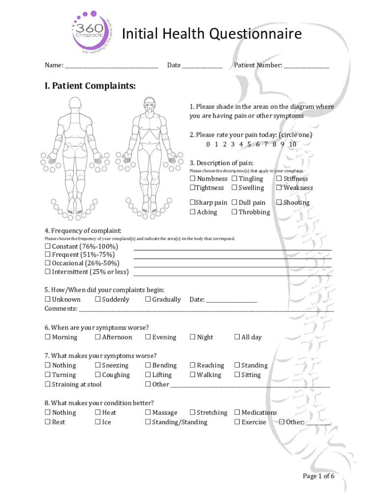 Initial Health Questionnaire Name: ___Date ___Patient Number: ___I. Patient Complaints: 1. Please shade in the areas on the diagram where you are having pain or other symptoms 2. Please rate your