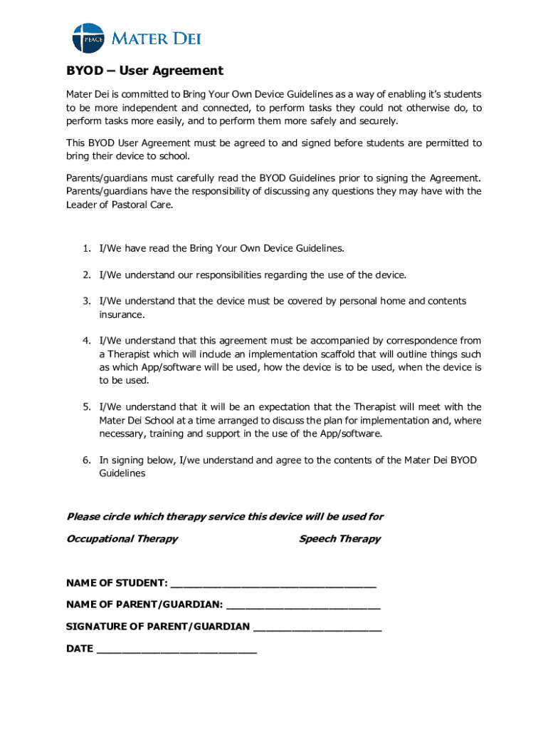 BYOD User Agreement Mater Dei is committed to Bring Your Own Device Guidelines as a way of enabling its students to be more independent and connected, to perform tasks they could not otherwise do,