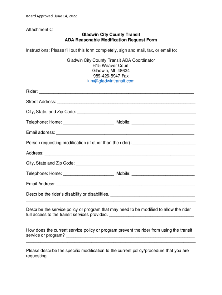 Board Approved: June 14, 2022Attachment C Gladwin City County Transit ADA Reasonable Modification Request Form Instructions: Please fill out this form completely, sign and mail, fax, or email to: