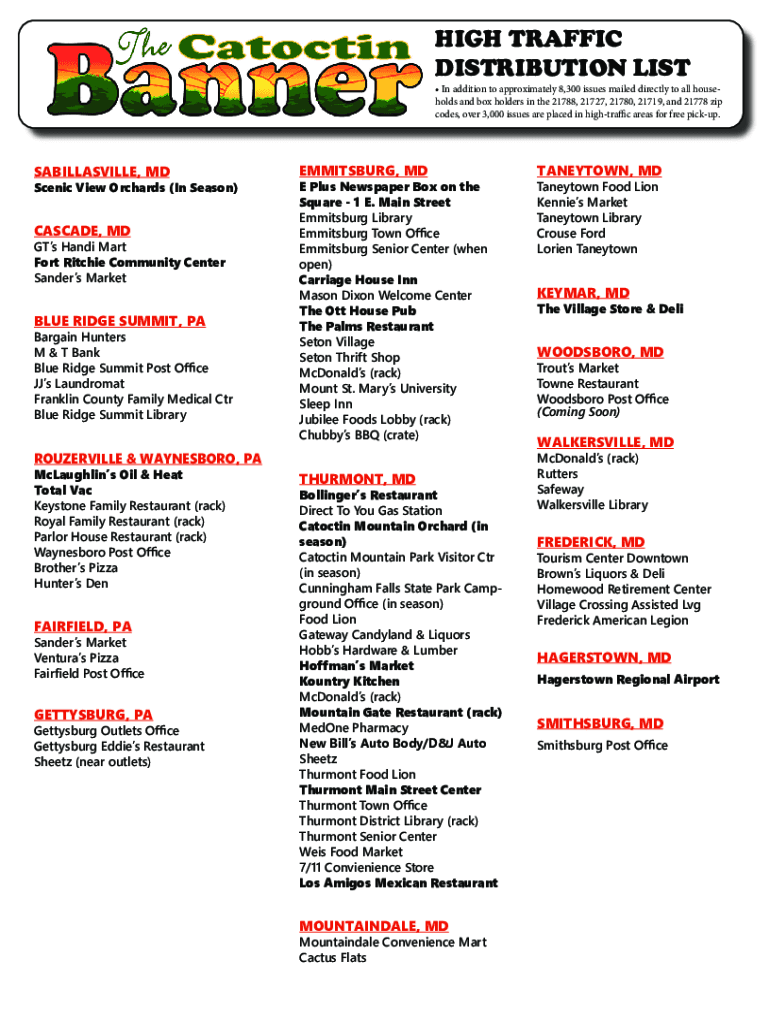 HIGH TRAFFIC DISTRIBUTION LIST In addition to approximately 8,300 issues mailed directly to all households and box holders in the 21788, 21727, 21780, 21719, and 21778 zip codes, over 3,000 issues