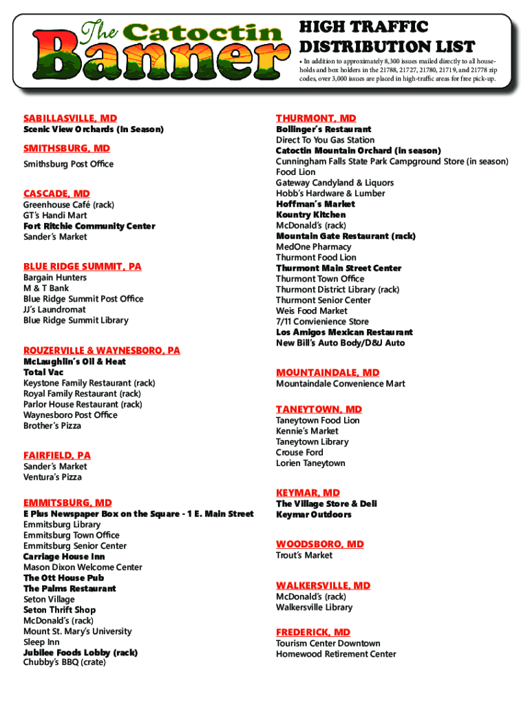 HIGH TRAFFIC DISTRIBUTION LIST In addition to approximately 8,300 issues mailed directly to all households and box holders in the 21788, 21727, 21780, 21719, and 21778 zip codes, over 3,000 issues