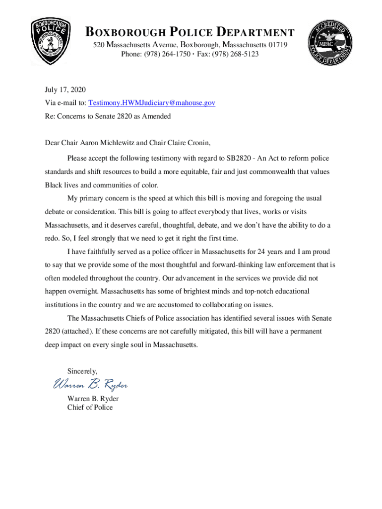 B OXBOROUGH P OLICE D EPARTMENT 520 Massachusetts Avenue, Boxborough, Massachusetts 01719 Phone: (978) 2641750 Fax: (978) 2685123July 17, 2020 Via email to: Testimony.HWMJudiciary@mahouse.gov Re: