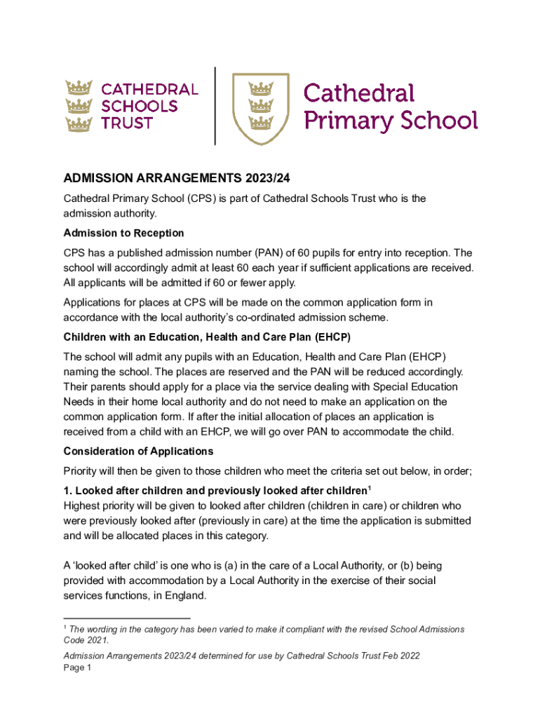 ADMISSION ARRANGEMENTS 2023/24 Cathedral Primary School (CPS) is part of Cathedral Schools Trust who is the admission authority. Admission to Reception CPS has a published admission number (PAN) of
