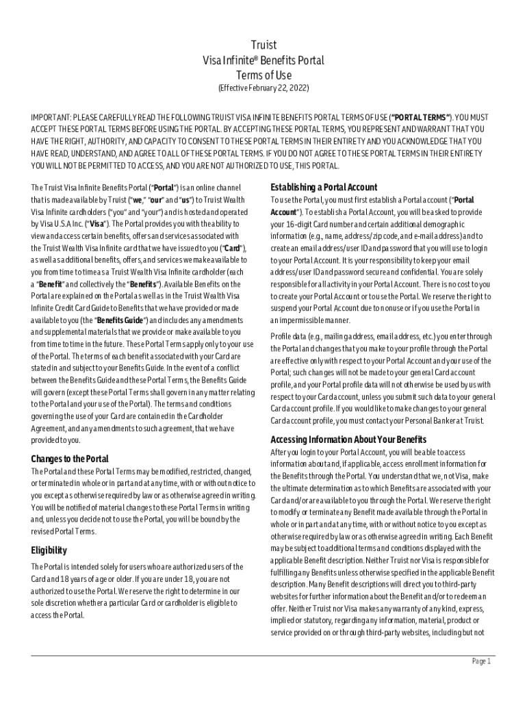 Truist Visa Infinite Benefits Portal Terms of Use (Effective February 22, 2022) IMPORTANT: PLEASE CAREFULLY READ THE FOLLOWING TRUIST VISA INFINITE BENEFITS PORTAL TERMS OF USE (PORTAL TERMS). YOU
