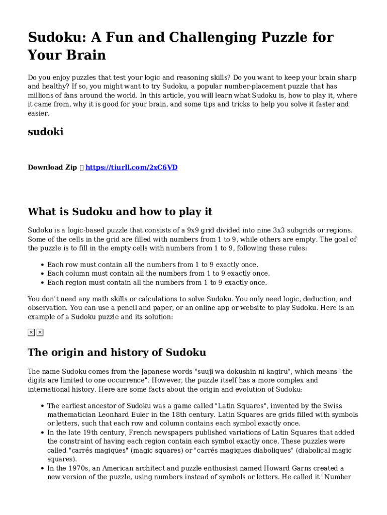 Sudoku: A Fun and Challenging Puzzle for Your Brain Do you enjoy puzzles that test your logic and reasoning skills? Do you want to keep your brain sharp and healthy? If so, you might want to try Sudoku,