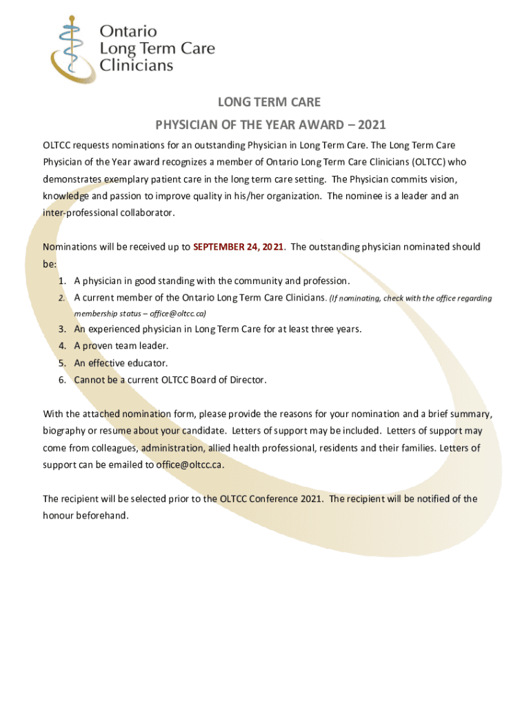 LONG TERM CARE PHYSICIAN OF THE YEAR AWARD 2021 OLTCC requests nominations for an outstanding Physician in Long Term Care. The Long Term Care Physician of the Year award recognizes a member of Ontario