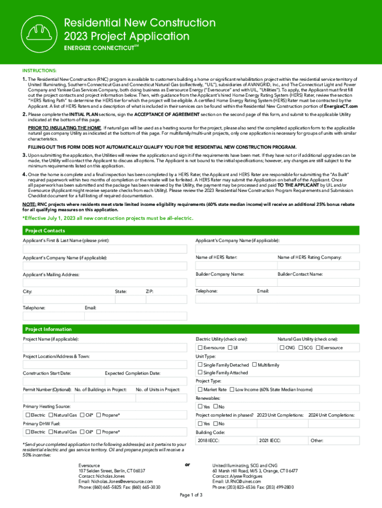 Residential New Construction 2023 Project Application SMENERGIZE CONNECTICUTINSTRUCTIONS:1. The Residential New Construction (RNC) program is available to customers building a home or significant