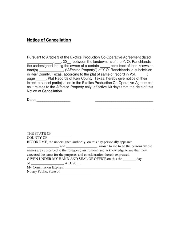 Notice of CancellationPursuant to Article 3 of the Exotics Production CoOperative Agreement dated ___, ___. 20__, between the landowners of the Y. O. Ranchlands, the undersigned, being the owner of
