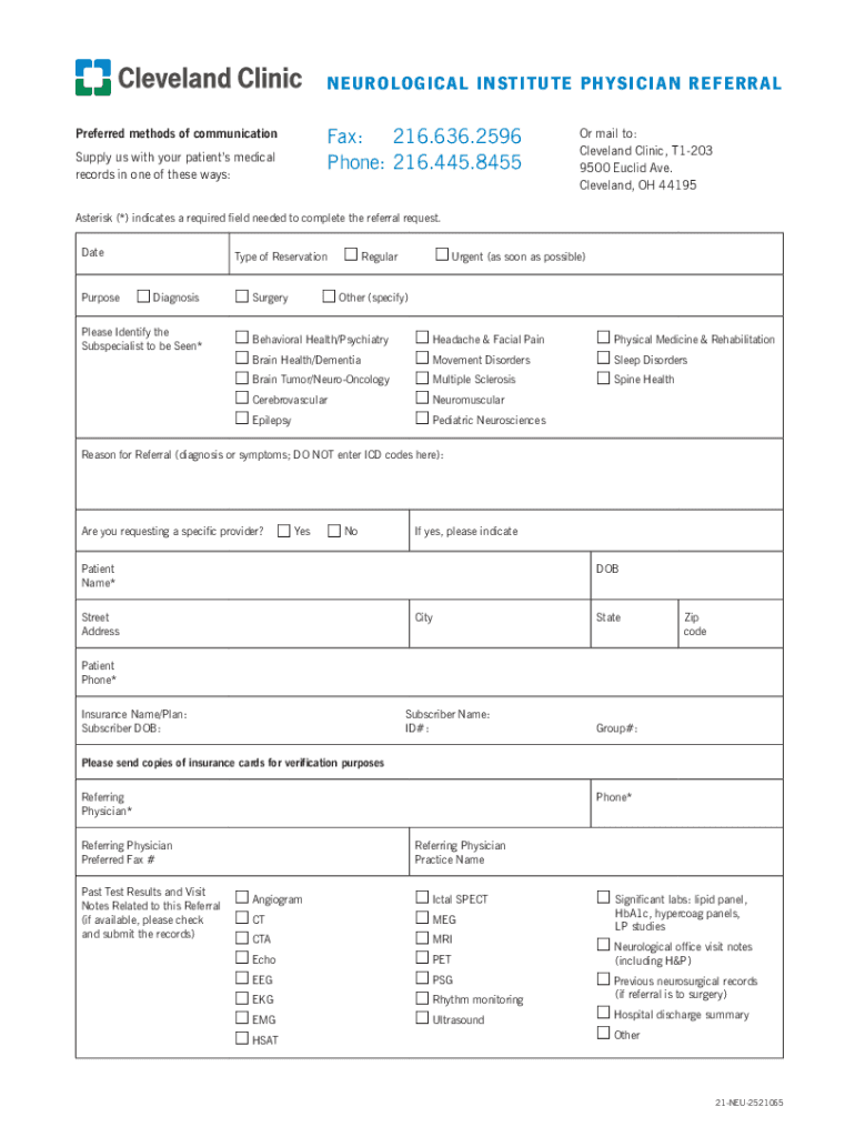 NEUROLOGICAL INSTITUTE PHYSICIAN REFERRALFax:216.636.2596 Phone: 216.445.8455Preferred methods of communication Supply us with your patients medical records in one of these ways:Or mail to: Cleveland