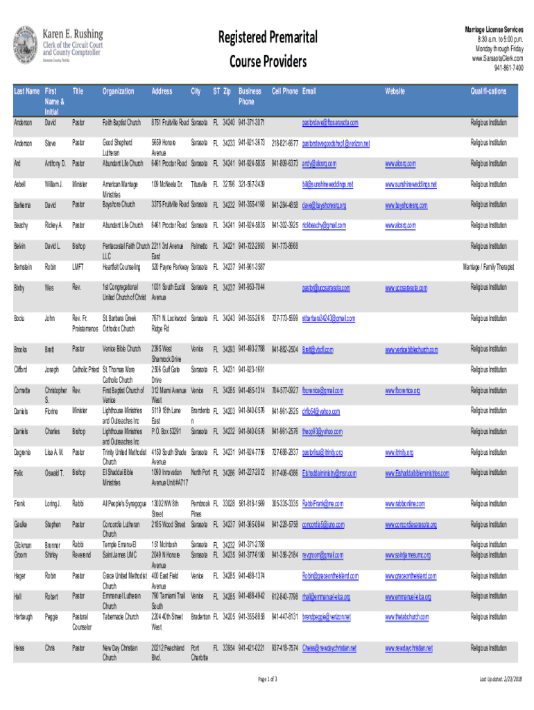 Marriage License Services 8:30 a.m. to 5:00 p.m. Monday through Friday www.SarsaotaClerk.com 9418617400Registered Premarital Course Providers Last NameTitleOrganizationAddressAndersonFirst Name &