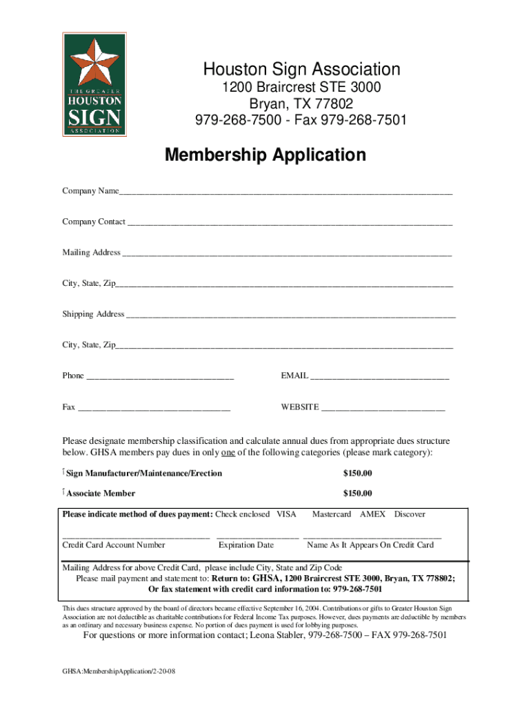 Houston Sign Association 1200 Braircrest STE 3000 Bryan, TX 77802 9792687500 Fax 9792687501Membership Application Company Name___Company Contact ___Mailing Address ___City, State, Zip___Shipping Address
