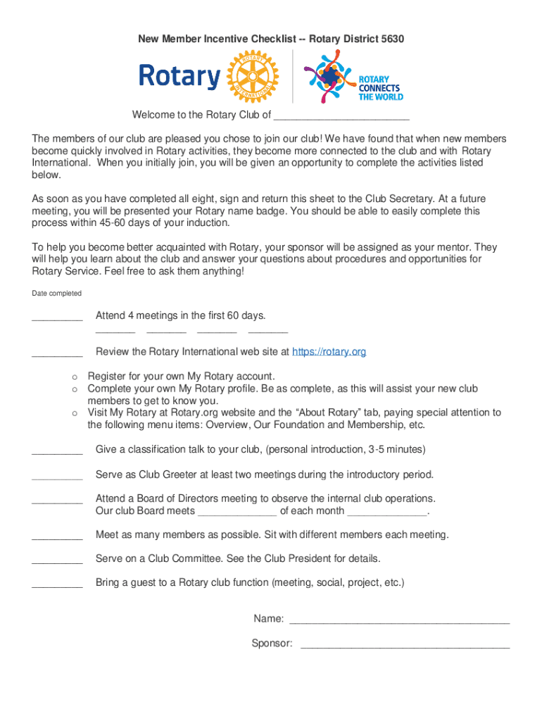 New Member Incentive Checklist Rotary District 5630Welcome to the Rotary Club of ___