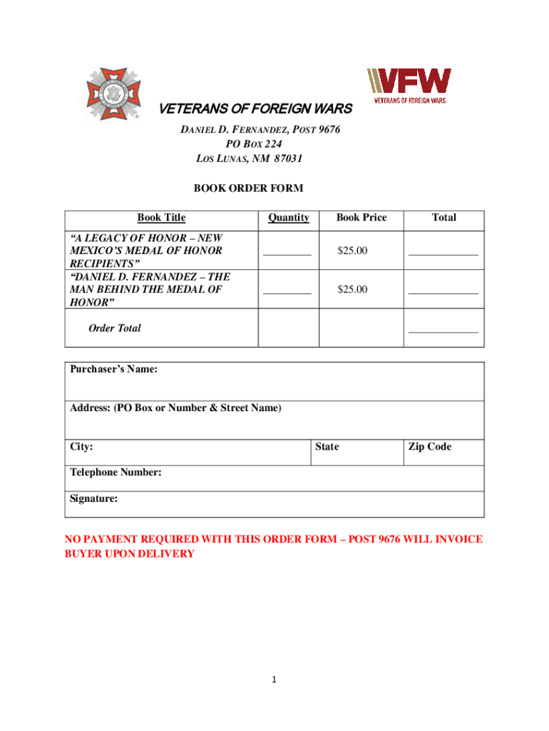 VETERANS OF FOREIGN WARS DANIEL D. FERNANDEZ, POST 9676 PO BOX 224 LOS LUNAS, NM 87031 BOOK ORDER FORM Book Title A LEGACY OF HONOR NEW MEXICOS MEDAL OF HONOR RECIPIENTS DANIEL D. FERNANDEZ THE MAN