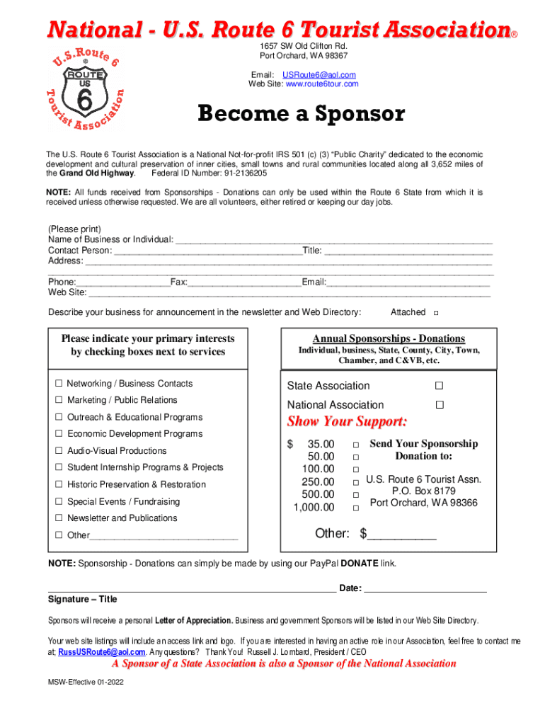 National U.S. Route 6 Tourist Association1657 SW Old Clifton Rd. Port Orchard, WA 98367 Email: USRoute6@aol.com Web Site: www.route6tour.comBecome a Sponsor The U.S. Route 6 Tourist Association is