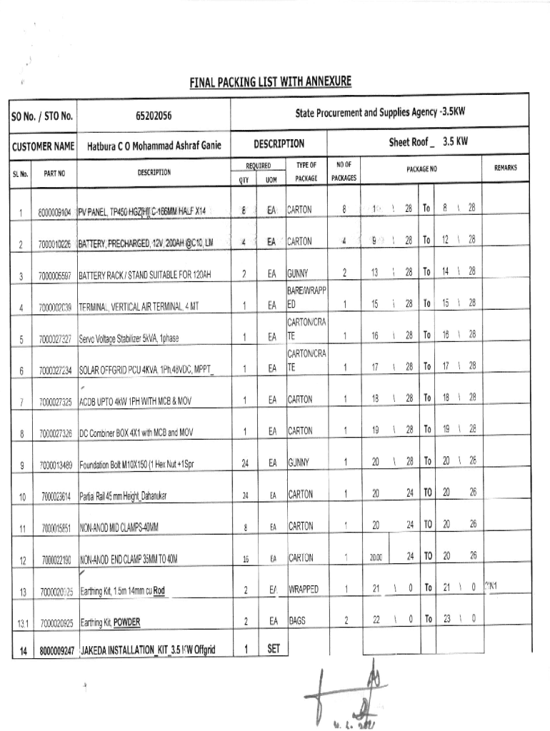 FINAL PACKING LIST WITH ANNEXURE SO No./REOUIREDDESCRIPTIONPART\'OliGzrt[ C165MMHALF X14TYPE OENO OFPACKAGEPACKAGESQTYUOMIEACARTONEACARTON GUNNY122821328To1428ED115To15 28EACARTON/CRA TE11628To16