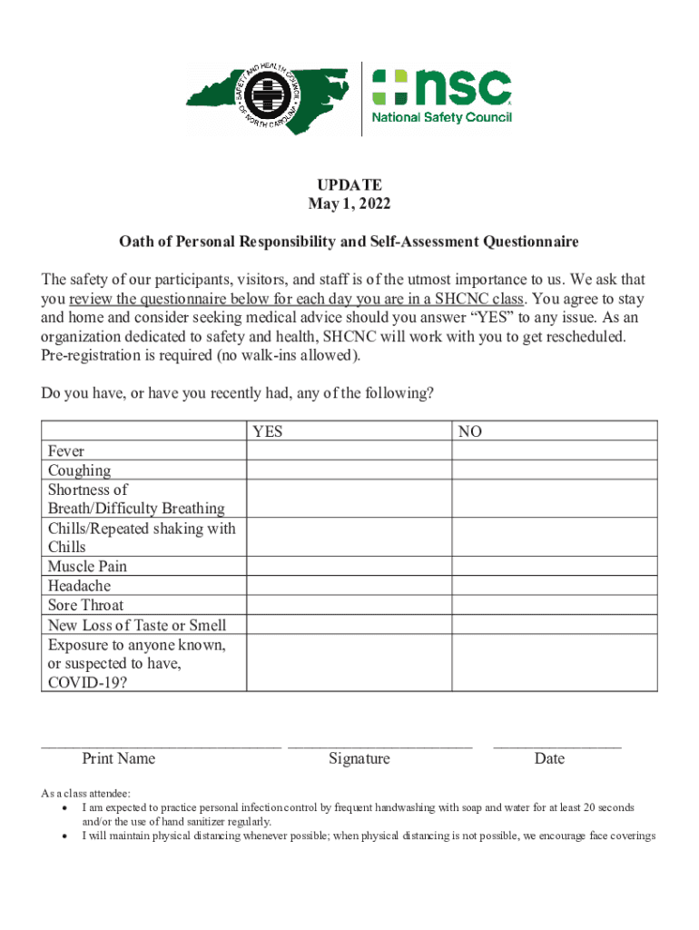 UPDATE May 1, 2022 Oath of Personal Responsibility and SelfAssessment Questionnaire The safety of our participants, visitors, and staff is of the utmost importance to us. We ask that you review the