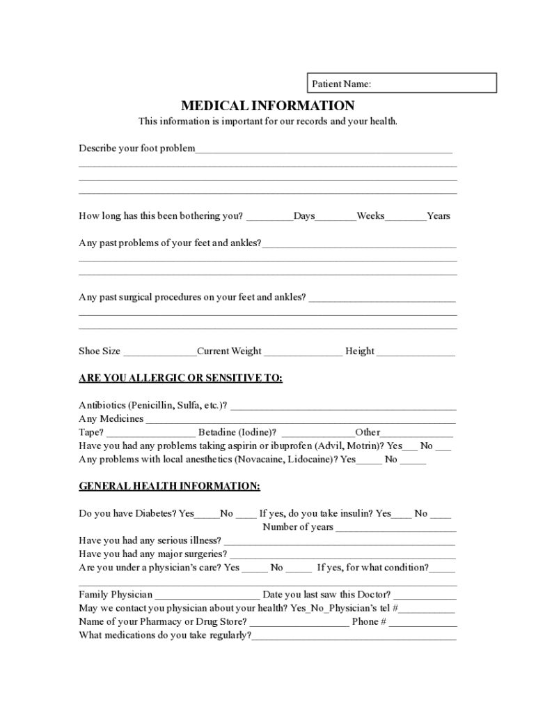 Patient Name:MEDICAL INFORMATION This information is important for our records and your health. Describe your foot problem___ ___ ___ ___ How long has this been bothering you? ___Days___Weeks___Years