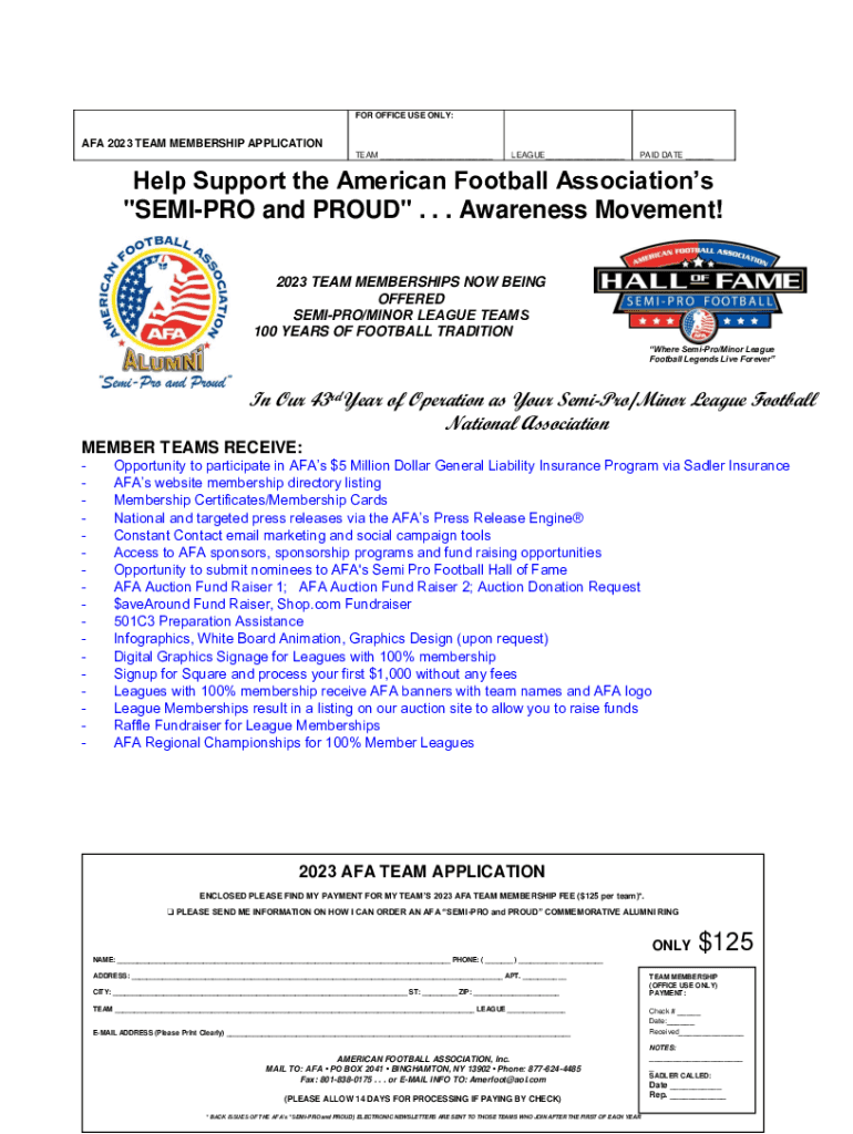 FOR OFFICE USE ONLY:AFA 2023 TEAM MEMBERSHIP APPLICATION TEAM ___LEAGUE___PAID DATE ___Help Support the American Football Associations \"SEMIPRO and PROUD\" . . . Awareness Movement! 2023 TEAM MEMBERSHIPS