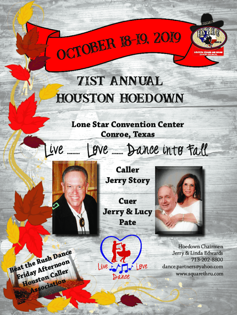 1 9 0 2 , 9 1 8 1 r e b o Oct 71st Annual Houston Hoedown Lone Star Convention Center Conroe, TexasLive ......... Love ........ Dance into Fall Caller Jerry Story Cuer Jerry & Lucy Pate nce a D sh