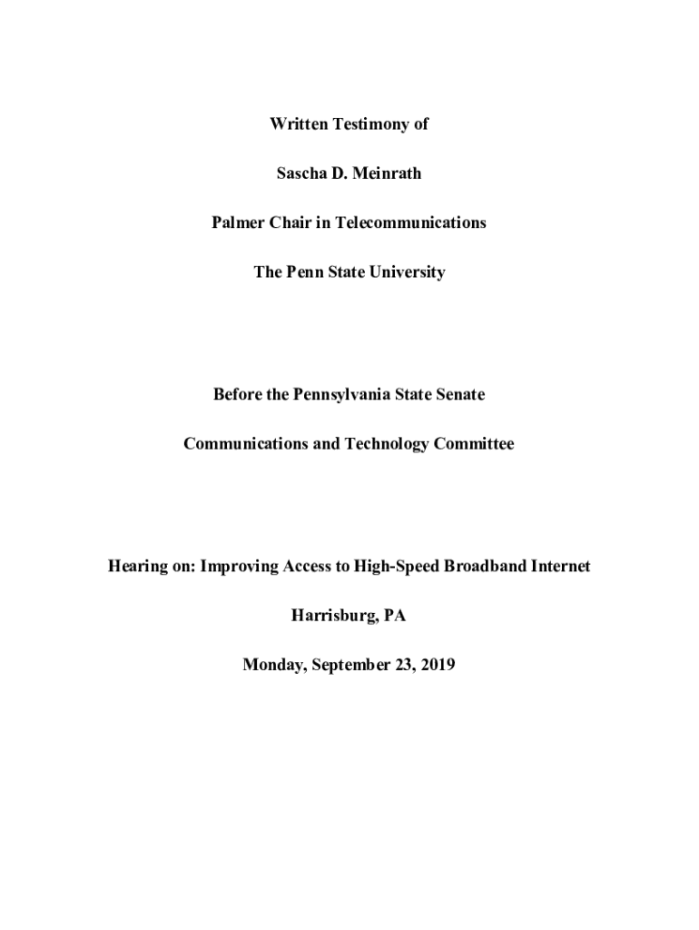 Written Testimony of Sascha D. Meinrath Palmer Chair in Telecommunications The Penn State UniversityBefore the Pennsylvania State Senate Communications and Technology CommitteeHearing on: Improving