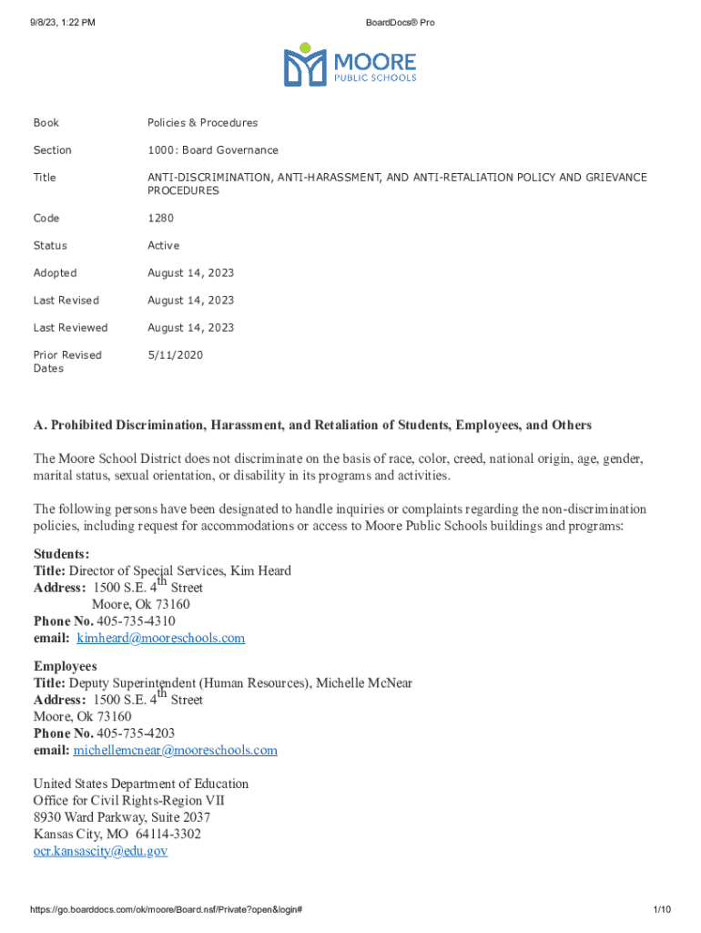 9/8/23, 1:22 PMBoardDocs ProBookPolicies & ProceduresSection1000: Board GovernanceTitleANTIDISCRIMINATION, ANTIHARASSMENT, AND ANTIRETALIATION POLICY AND GRIEVANCE PROCEDURESCode1280StatusActiveAdoptedAugust