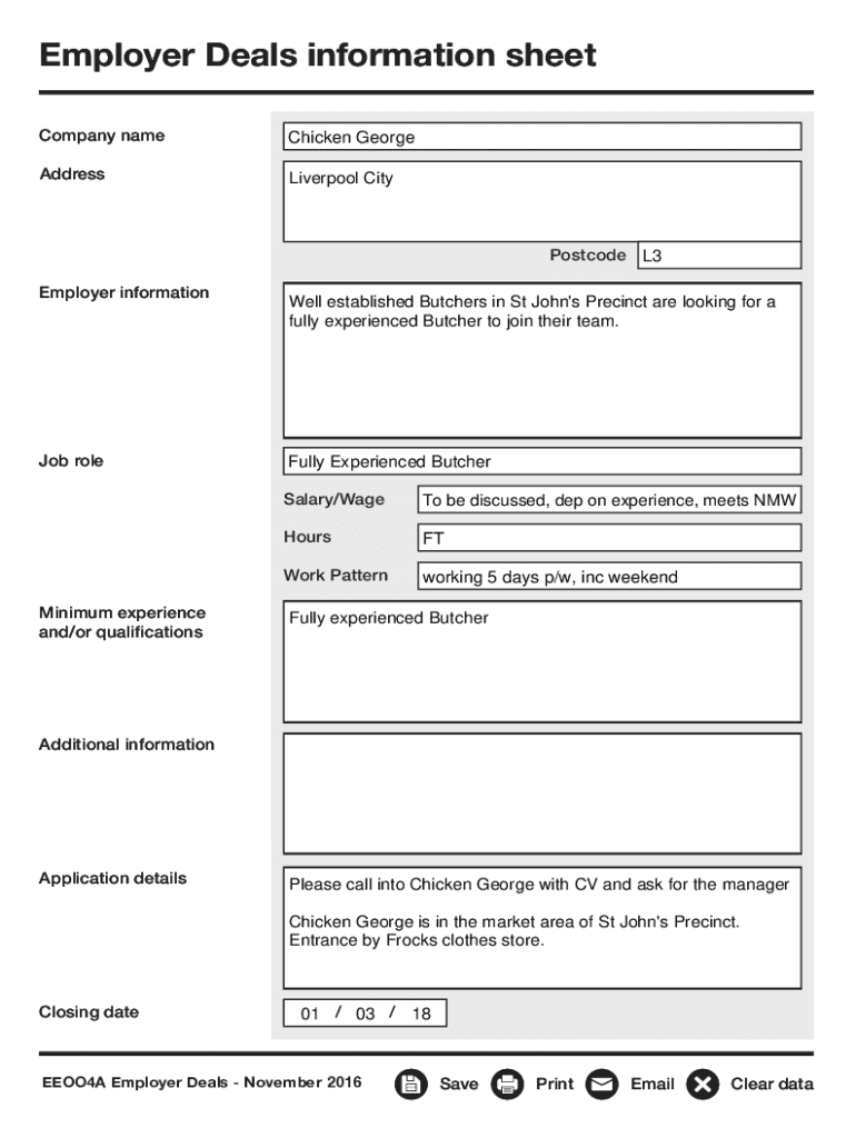 Employer Deals information sheet Company nameChicken GeorgeAddressLiverpool CityPostcode L3 Employer informationJob roleMinimum experience and/or qualificationsWell established Butchers in St John\'s