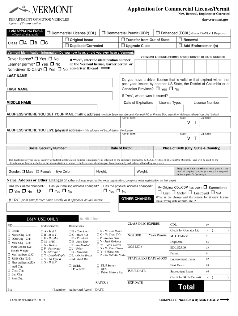 Get the free Application for Commercial LicensePermit - dmv vermont