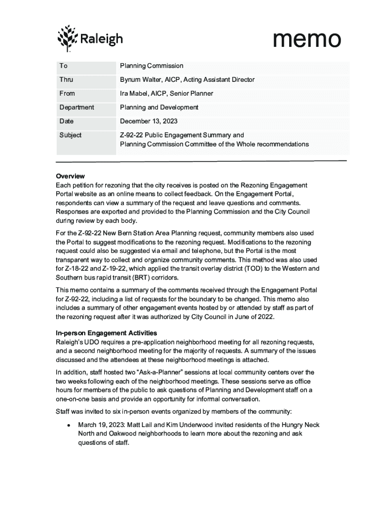 ToPlanning CommissionThruBynum Walter, AICP, Acting Assistant DirectorFromIra Mabel, AICP, Senior PlannerDepartmentPlanning and DevelopmentDateDecember 13, 2023SubjectZ9222 Public Engagement