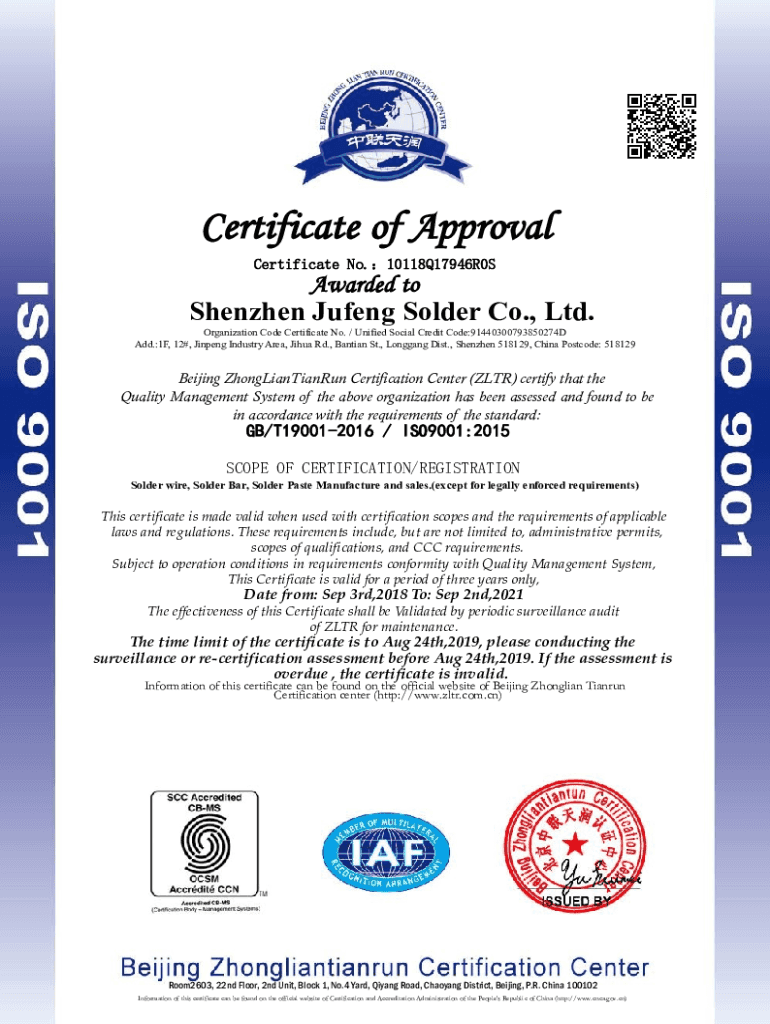 Certificate of Approval Certificate No.10118Q17946R0SAwarded toShenzhen Jufeng Solder Co., Ltd. Organization Code Certificate No. / Unified Social Credit Code:91440300793850274D Add.:1F, 12#, Jinpeng
