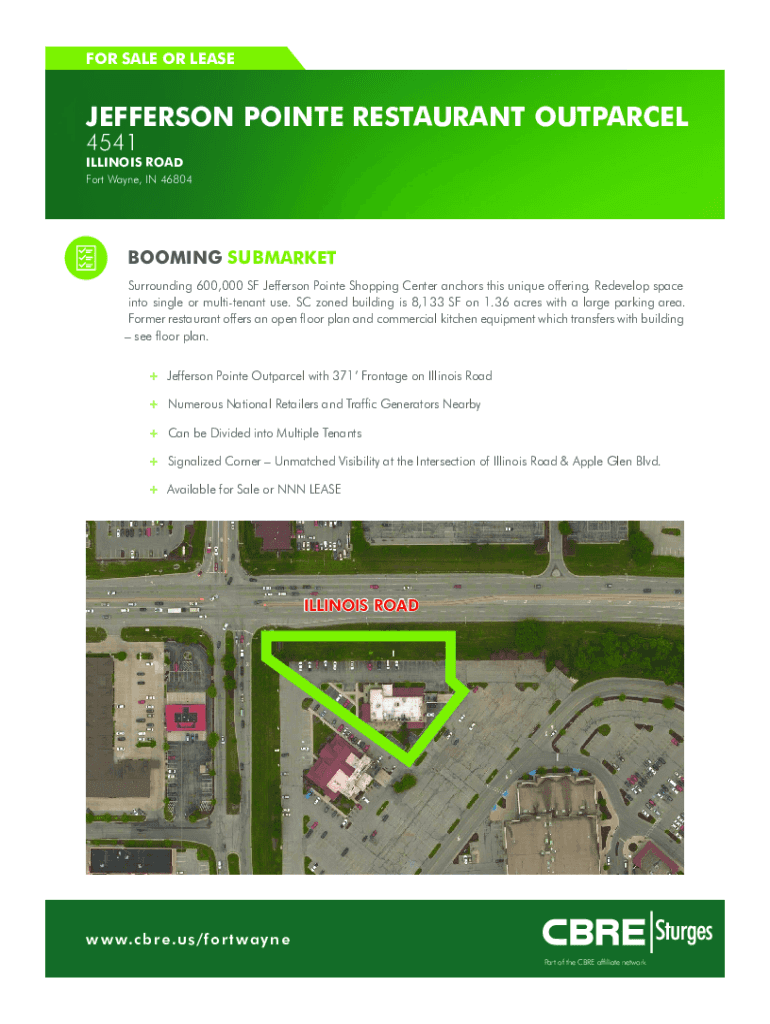 FOR SALE OR LEASEJEFFERSON POINTE RESTAURANT OUTPARCEL 4541ILLINOIS ROAD Fort Wayne, IN 46804BOOMING SUBMARKET Surrounding 600,000 SF Jefferson Pointe Shopping Center anchors this unique offering.
