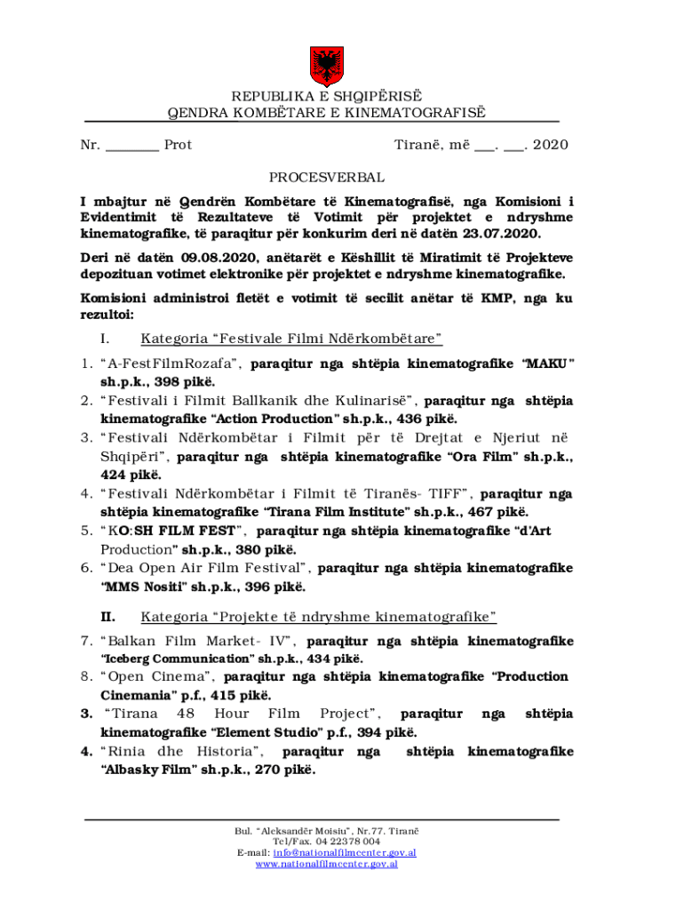 REPUBLIKA E SHQIPRIS QENDRA KOMBTARE E KINEMATOGRAFIS Nr. ___ ProtTiran, m ___. ___. 2020 PROCESVERBALI mbajtur n Qendrn Kombtare t Kinematografis, nga Komisioni i Evidentimit t Rezultateve t Votimit
