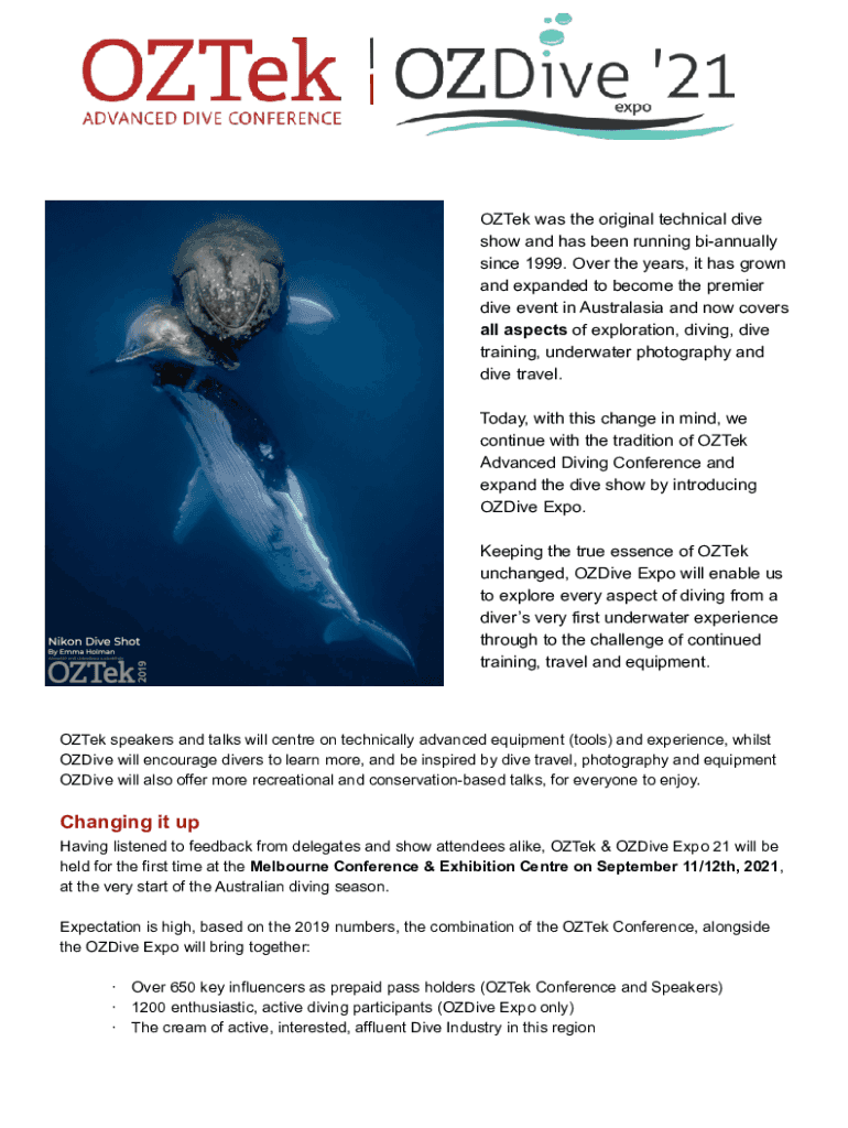 OZTek was the original technical dive show and has been running biannually since 1999. Over the years, it has grown and expanded to become the premier dive event in Australasia and now covers all