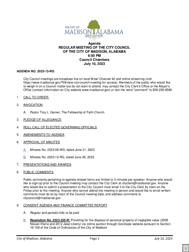 Get the free City of Madison, Alabama Page 1 July 10, 2023 Agenda ...