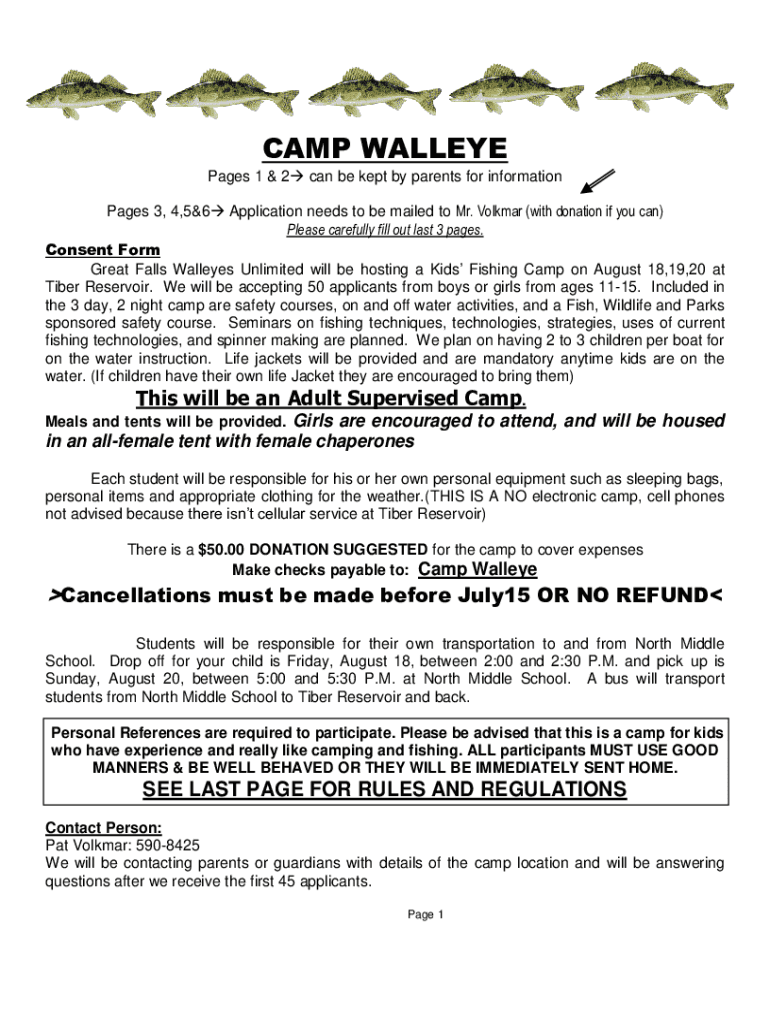 CAMP WALLEYE Pages 1 & 2 can be kept by parents for information Pages 3, 4,5&6 Application needs to be mailed to Mr. Volkmar (with donation if you can) Please carefully fill out last 3 pages. Consent