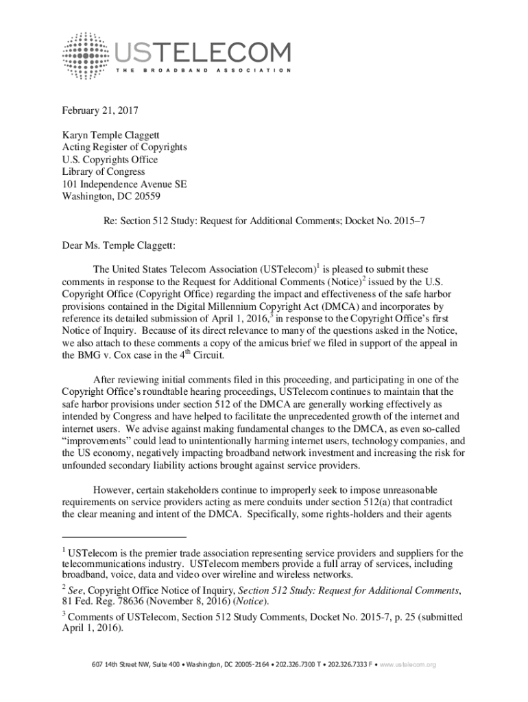 February 21, 2017 Karyn Temple Claggett Acting Register of Copyrights U.S. Copyrights Office Library of Congress 101 Independence Avenue SE Washington, DC 20559 Re: Section 512 Study: Request for