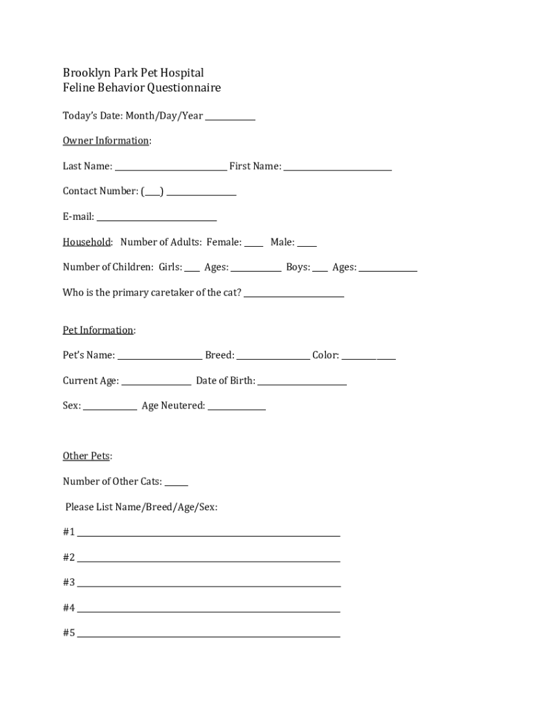 Brooklyn Park Pet Hospital Feline Behavior Questionnaire Todays Date: Month/Day/Year ___ Owner Information: Last Name: ___ First Name: ___ Contact Number: (___) ___ Email: ___ Household: Number of
