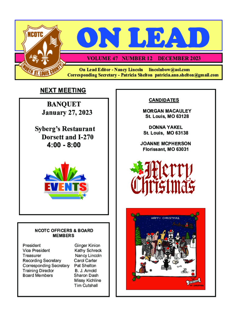 ON LEAD VOLUME 47 NUMBER 12DECEMBER 2023On Lead Editor Nancy Lincoln lincolnbow@aol.com Corresponding Secretary Patricia Shelton patricia.ann.shelton@gmail.comNEXT MEETINGBANQUET January 27, 2023