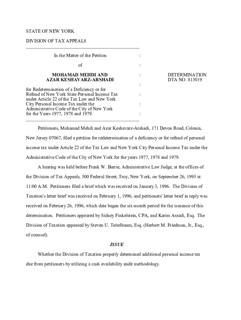 STATE OF NEW YORK DIVISION OF TAX APPEALS ___ In the Matter of the Petition:of:MOHAMAD MEHDI AND AZAR KESHAVARZARSHADI:: for Redetermination of a Deficiency or for Refund of New York State Personal