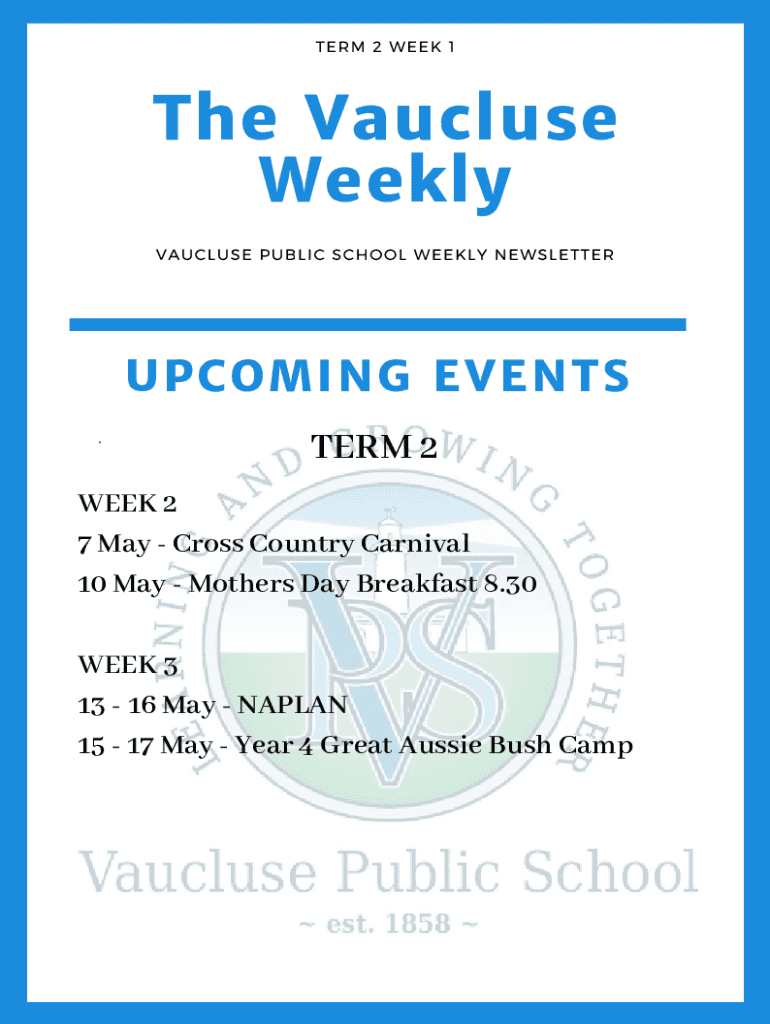 TERM 2 WEEK 1The Vaucluse Weekly VAUCLUSE PUBLIC SCHOOL WEEKLY NEWSLETTERUPCOMING EVENTS .TERM 2WEEK 2 7 May Cross Country Carnival 10 May Mothers Day Breakfast 8.30 WEEK 3 13 16 May NAPLAN 15 17