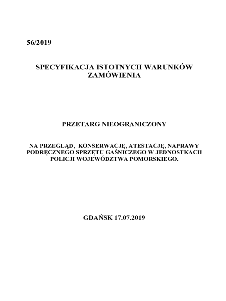 56/2019SPECYFIKACJA ISTOTNYCH WARUNKW ZAMWIENIAPRZETARG NIEOGRANICZONYNA PRZEGLD, KONSERWACJ, ATESTACJ, NAPRAWY PODRCZNEGO SPRZTU GANICZEGO W JEDNOSTKACH POLICJI WOJEWDZTWA POMORSKIEGO.GDASK 17.07.2019SPIS