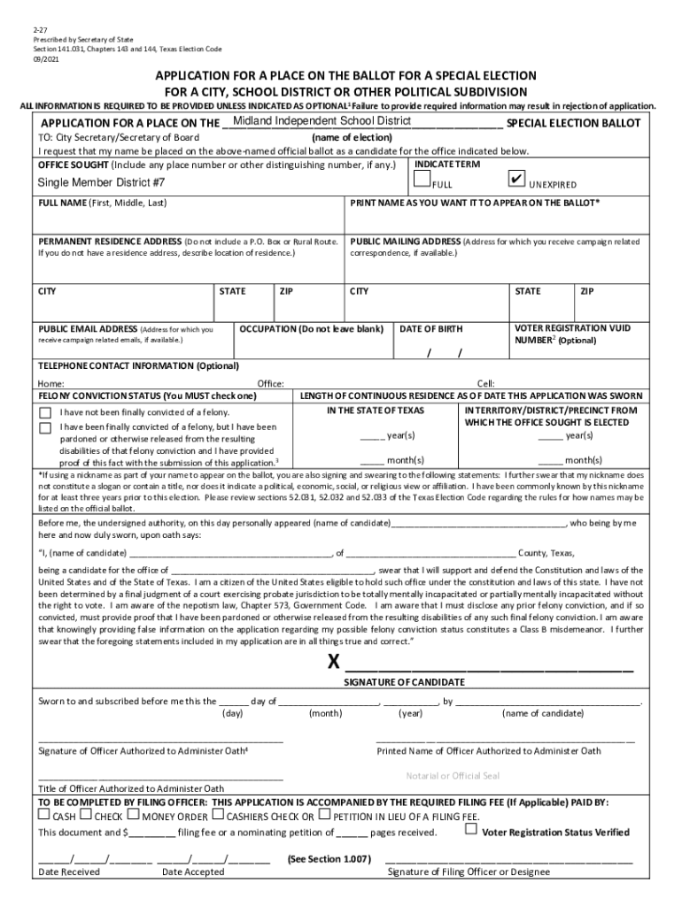 227 Prescribed by Secretary of State Section 141.031, Chapters 143 and 144, Texas Election Code 09/2021APPLICATION FOR A PLACE ON THE BALLOT FOR A SPECIAL ELECTION FOR A CITY, SCHOOL DISTRICT OR OTHER