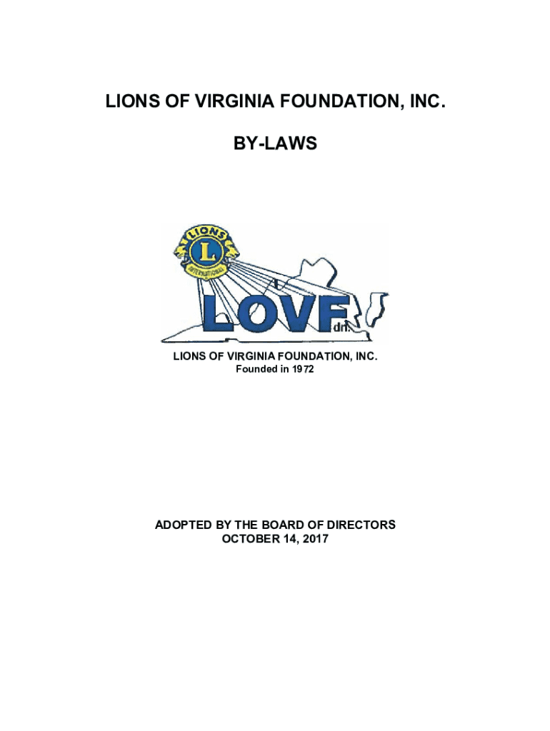 LIONS OF VIRGINIA FOUNDATION, INC. BYLAWSLIONS OF VIRGINIA FOUNDATION, INC. Founded in 1972ADOPTED BY THE BOARD OF DIRECTORS OCTOBER 14, 2017BYLAWS OF LIONS OF VRGINIA FOUNDATION, NC ARTICLE I Name